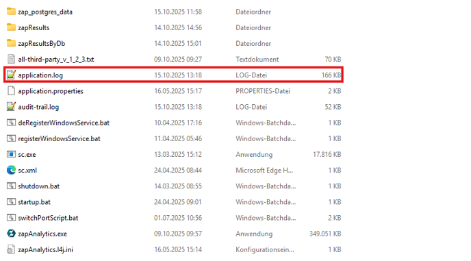 The application.log file is located in the zapAnalytics installation folder. It contains important information about the startup and operation of the software and is required by your Customer Success Manager for effective support.