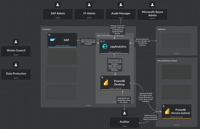 zapAnalytics - Digital Audit Preparation licenses the one-time creation of a project in our software zapAnalytics. For digital audit preparation, your SAP data is extracted, and the zapliance indicators are automatically analyzed. The result is a compilation of PowerBI files and exports that allows the user to understand SAP usage, identify key risk and opportunity indicators, and gain deeper insights into the data.