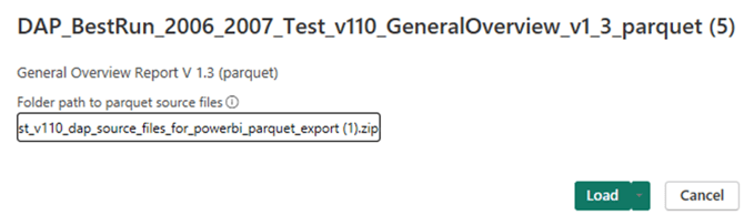 - Open one of the Power BI template files (pbit) and insert the file path of the zapAnalytics result file. Click the Load button to generate the Power BI report.