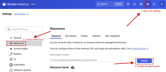 In the "Advanced" tab, you can select the default storage location. Choose any other disk with suffient free disk space. E.g. D:\docker-wsl